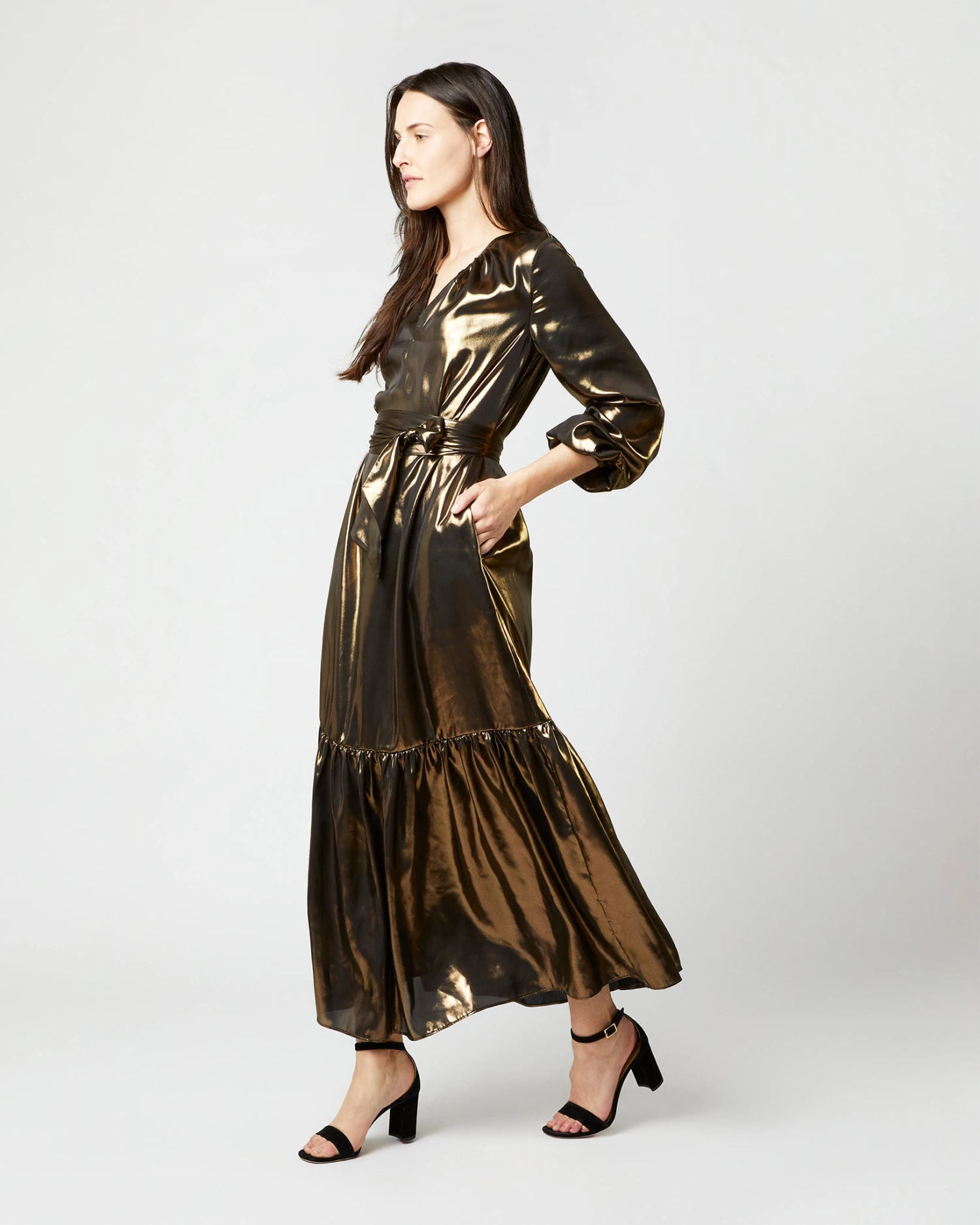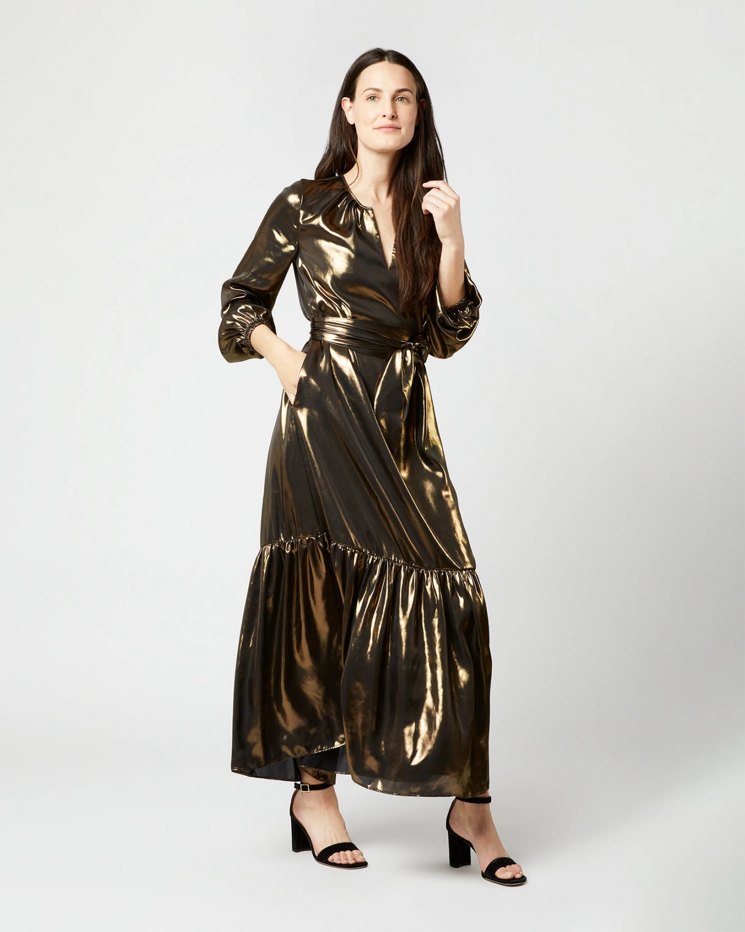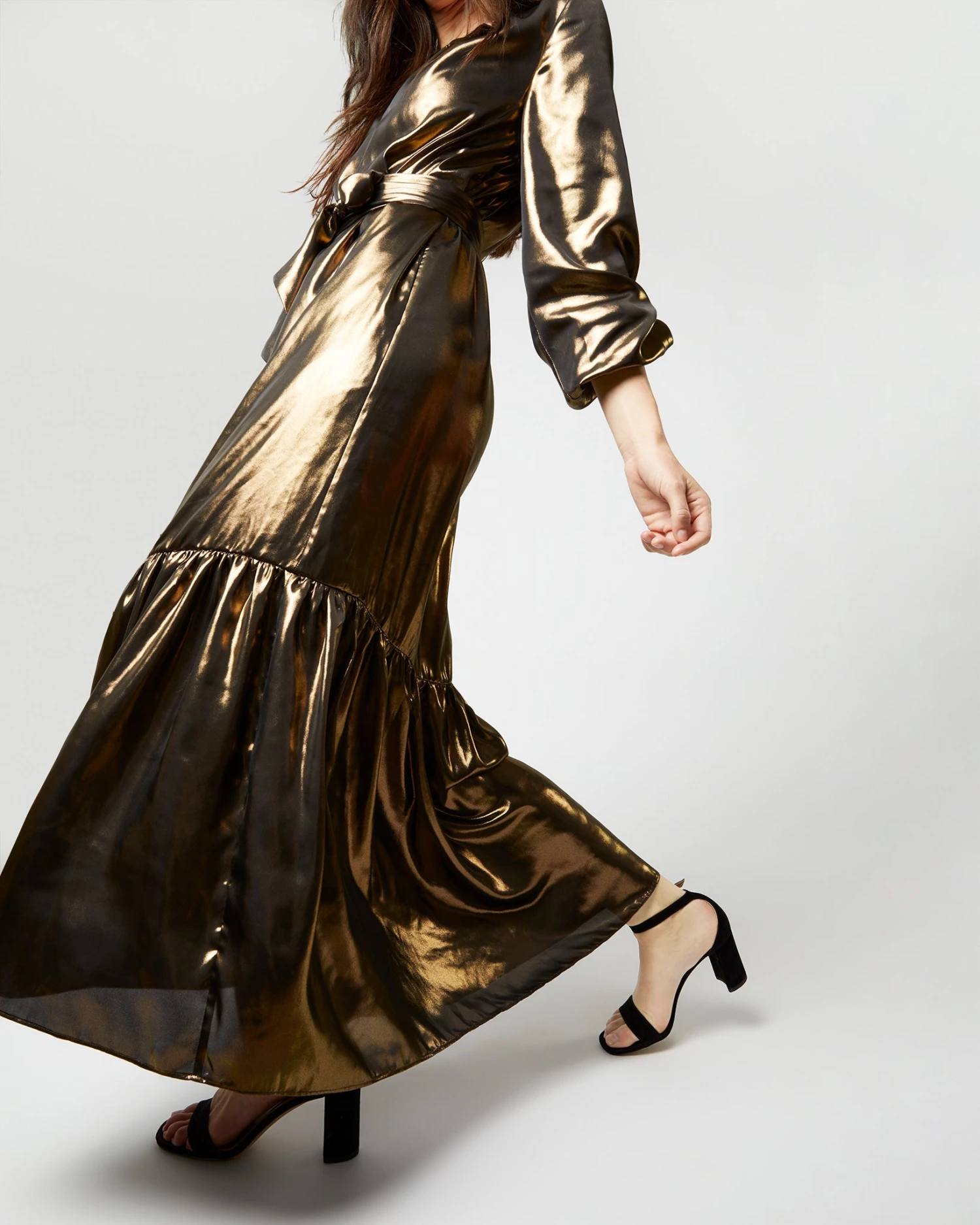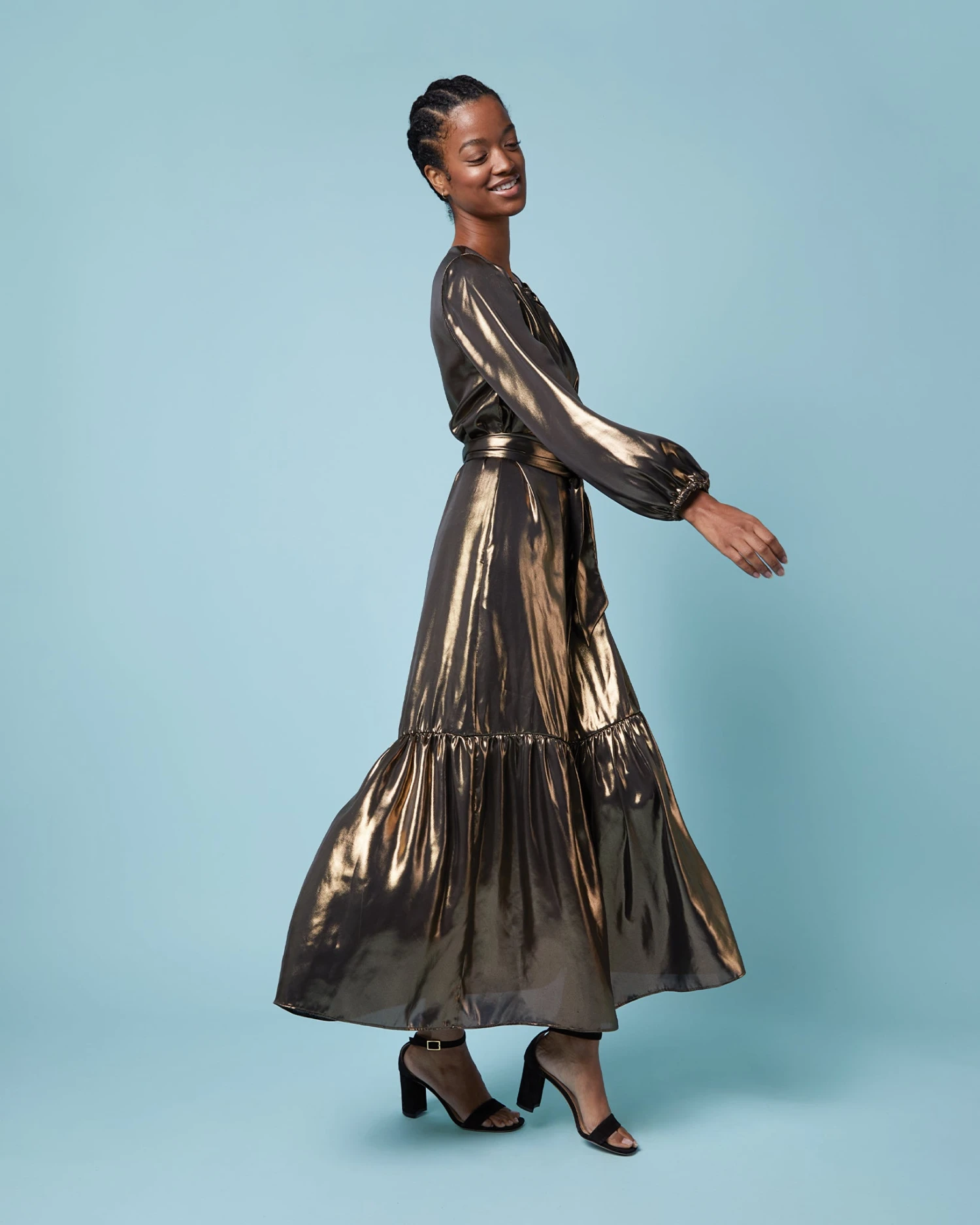 The Aba is a super easy party silhouette to dress up or down or somewhere in between. (Proof: Ann claims she’s worn it to three or four weddings herself.) There’s a hook-and-eye closure at the top of the neck, which can give it a slightly different look when you wear it closed vs. open, plus elasticated cuffs and a chic, optional self-tie belt. This one is made up in a very beautiful, very special lamé — created with a heat-transfer process that gives the fabric a fantastic texture. All of the shimmer, none of the scratchiness.