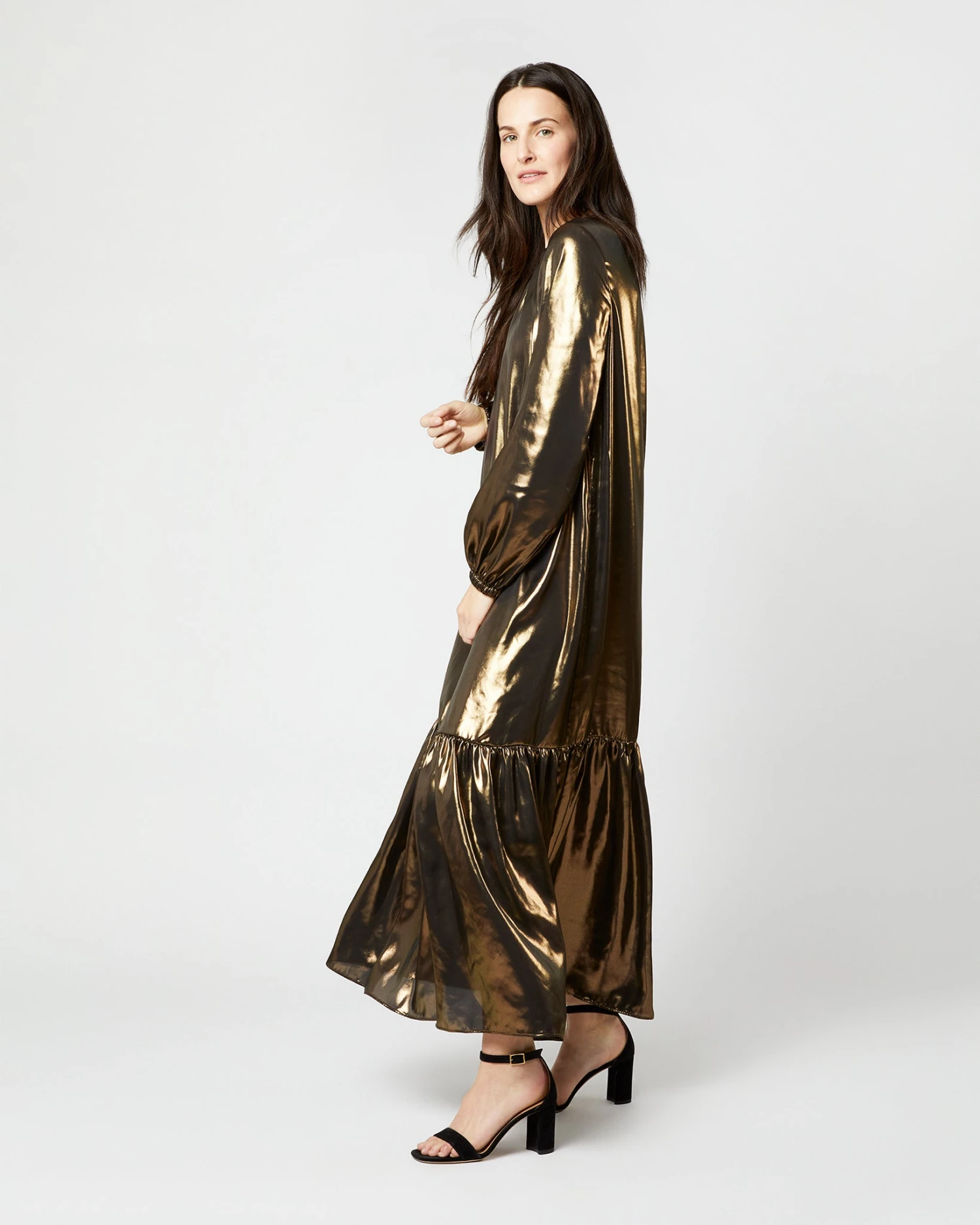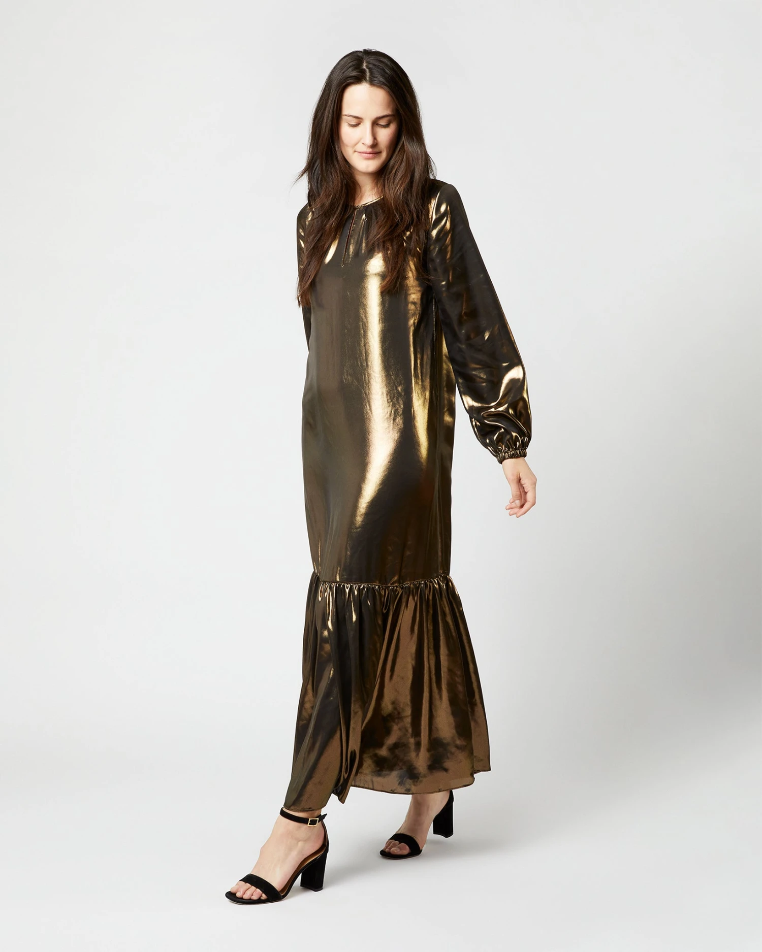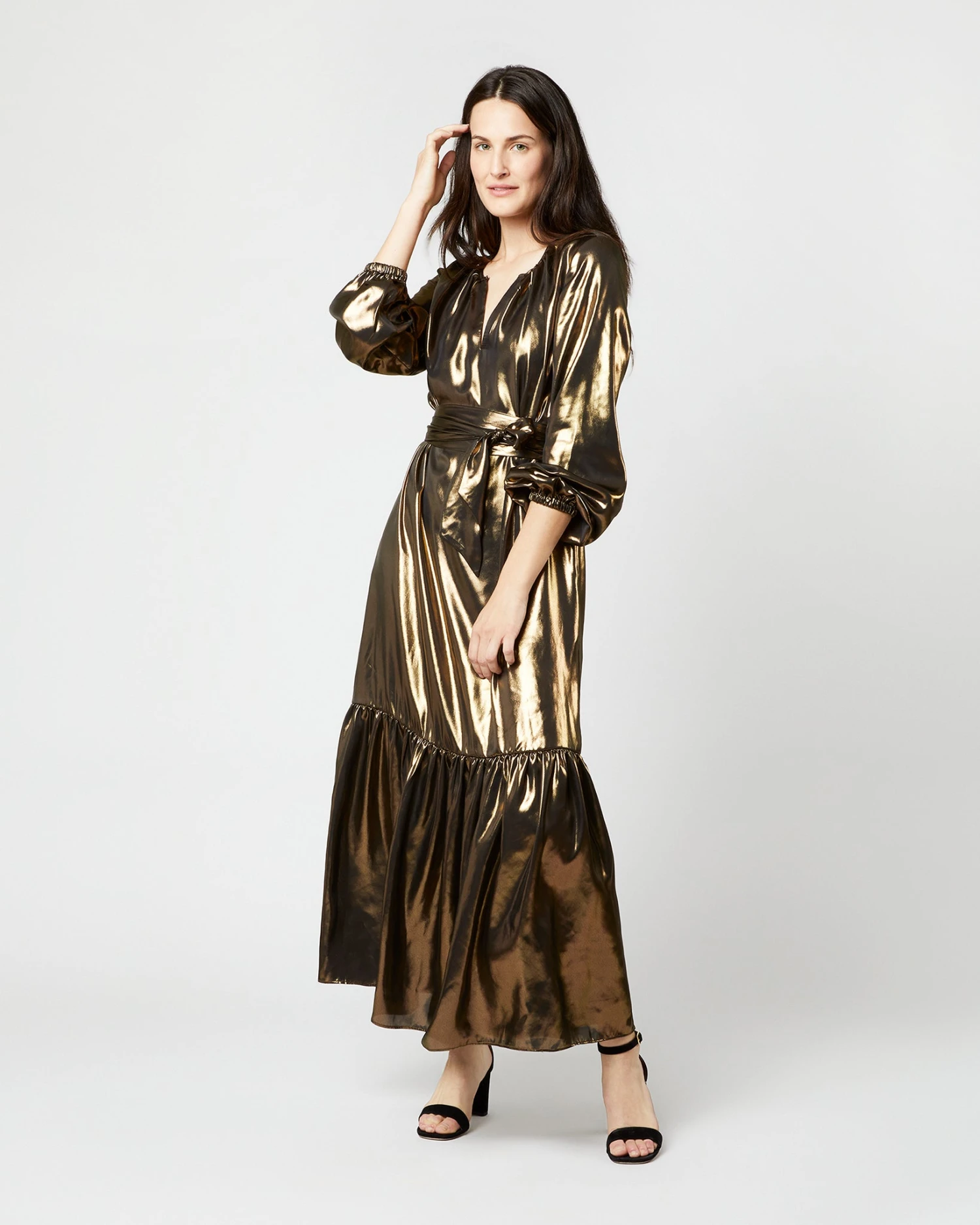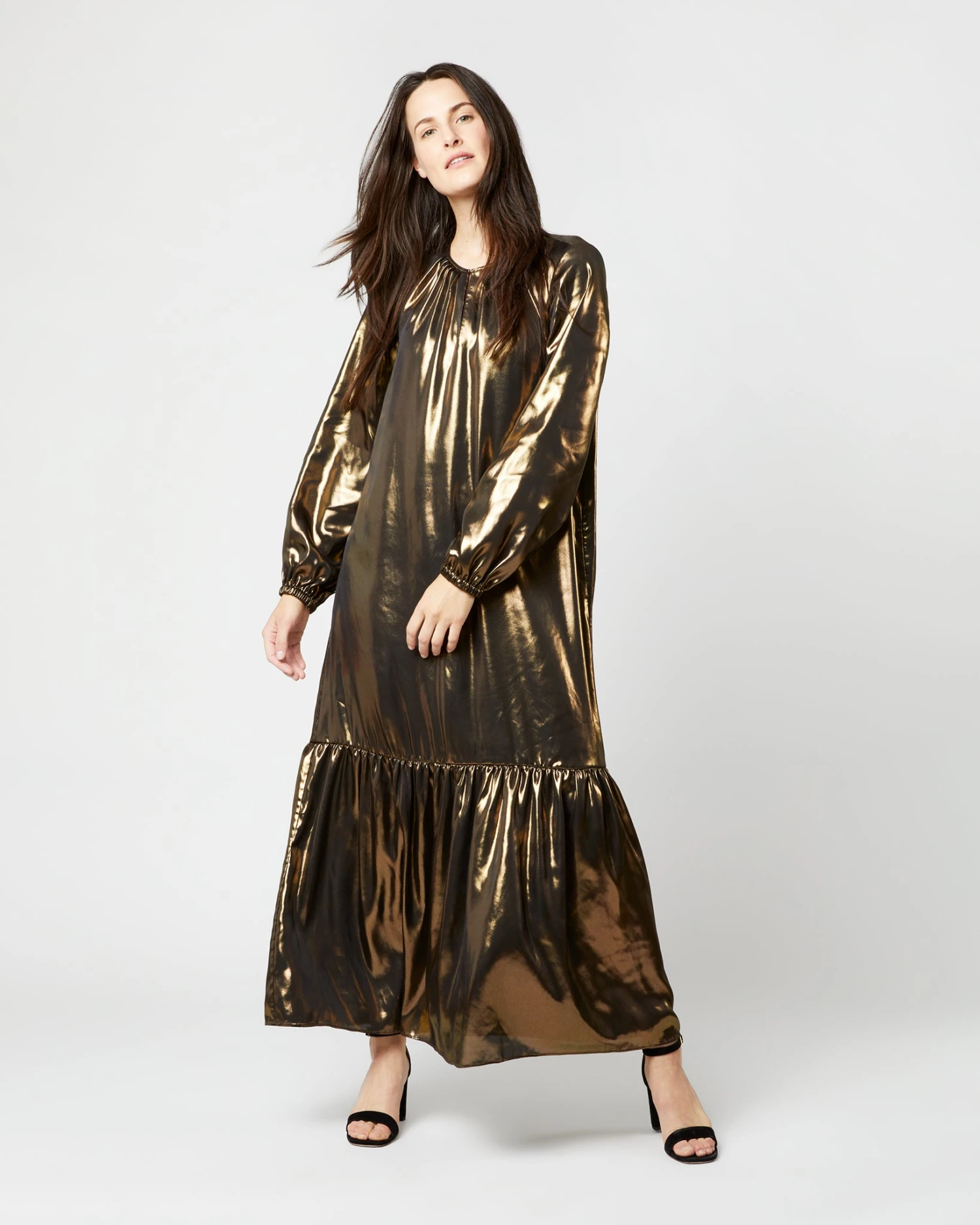 The Aba is a super easy party silhouette to dress up or down or somewhere in between. (Proof: Ann claims she’s worn it to three or four weddings herself.) There’s a hook-and-eye closure at the top of the neck, which can give it a slightly different look when you wear it closed vs. open, plus elasticated cuffs and a chic, optional self-tie belt. This one is made up in a very beautiful, very special lamé — created with a heat-transfer process that gives the fabric a fantastic texture. All of the shimmer, none of the scratchiness.