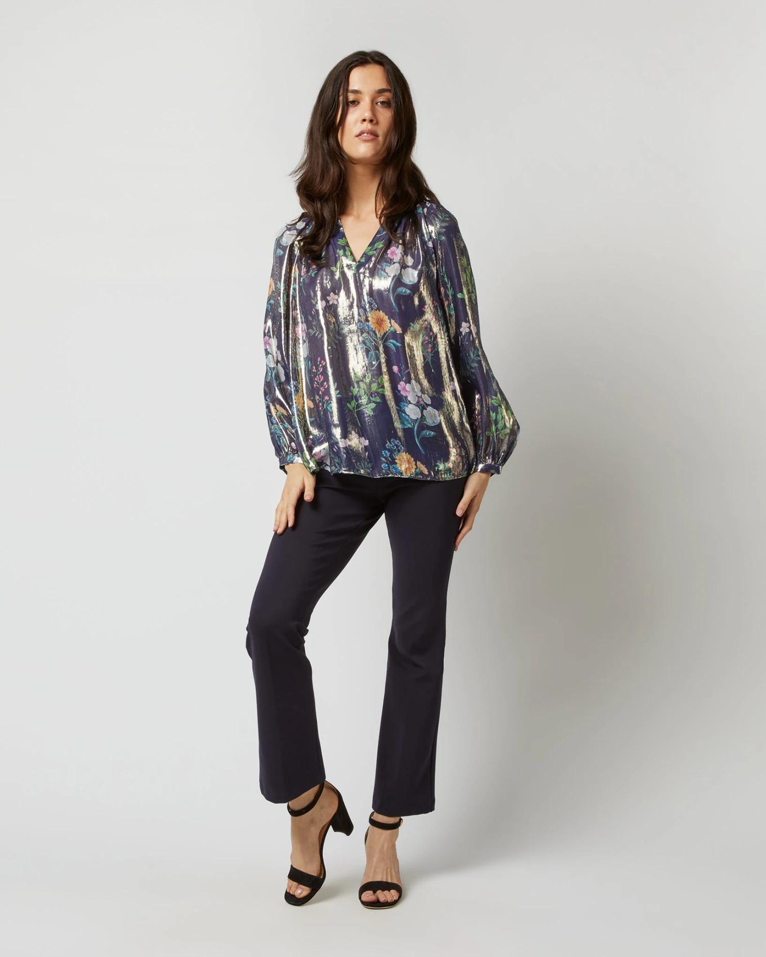 SKU: C2HVC 7392430391482 Category: Shirts & Tops Tags: Holiday 2023 Catalog Drop 1, LineDescr_Womens, NEST Ariana Blouse, WebColor_Navy/Metallic Floral Academy Liberty Fabric Lamé