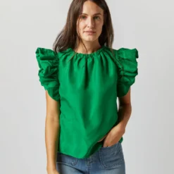 Milan-based La DoubleJ makes party-ready skirts and dresses in reissued vintage fabrics, “distilled through a lens of pure joy, eye-popping print and love of all things maximal.” Sounds about right! This is a wear-anywhere ruffled dress made of crisp cotton poplin. It’s got elasticated puff sleeves, a tiered skirt, and a cinched waist trimmed with ribbon ties.