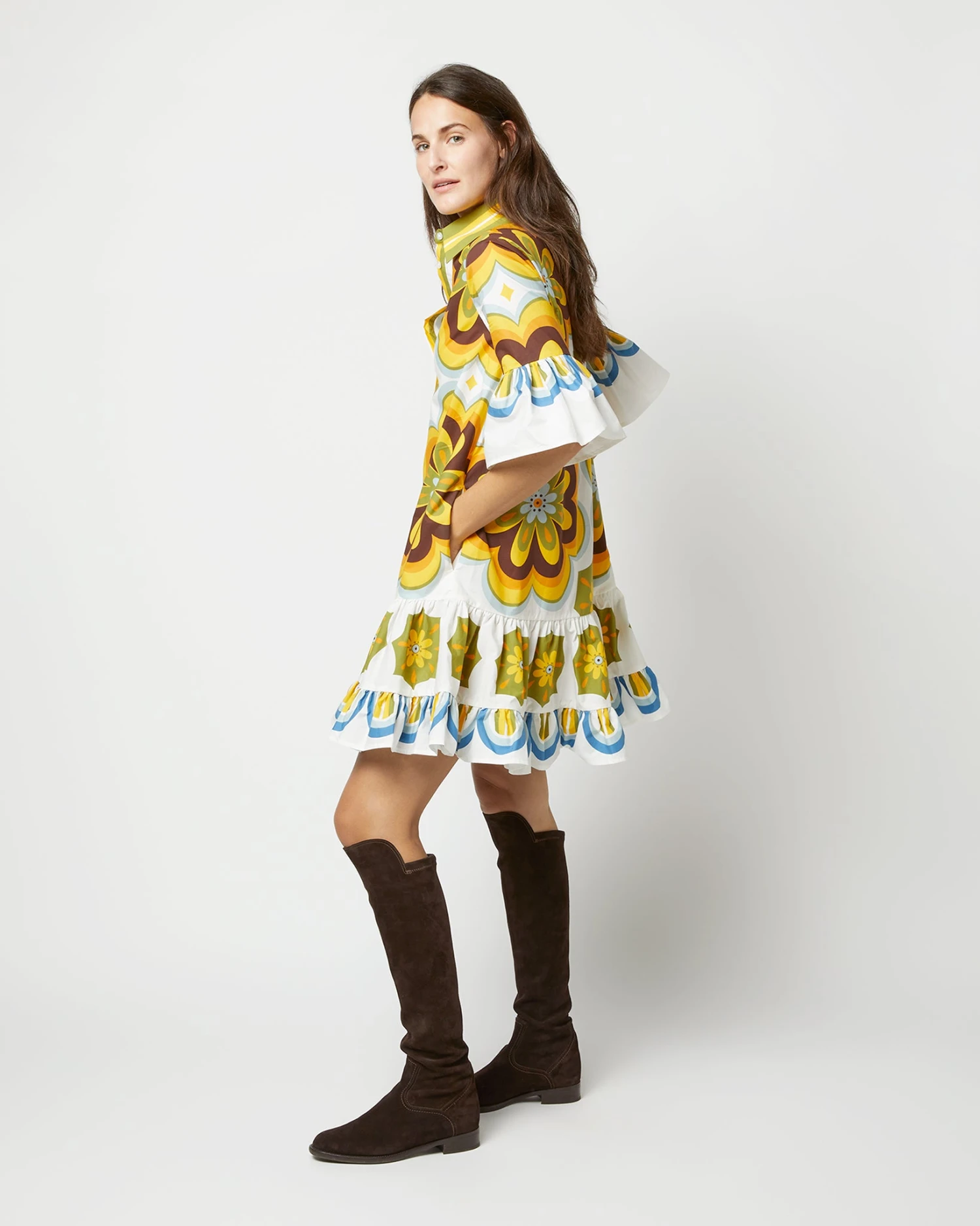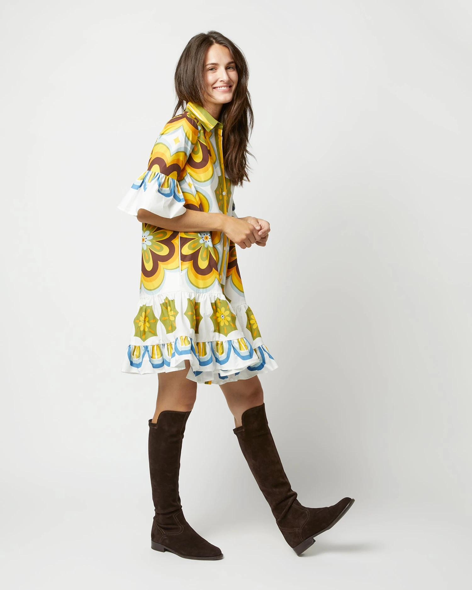 Milan-based La DoubleJ makes party-ready skirts and dresses in reissued vintage fabrics, “distilled through a lens of pure joy, eye-popping print and love of all things maximal.” Sounds about right! The Choux Dress has fluted three-quarter sleeves, a pointed collar, and a tiered skirt. This one is made from Italian cotton poplin with a placed, geometric print.