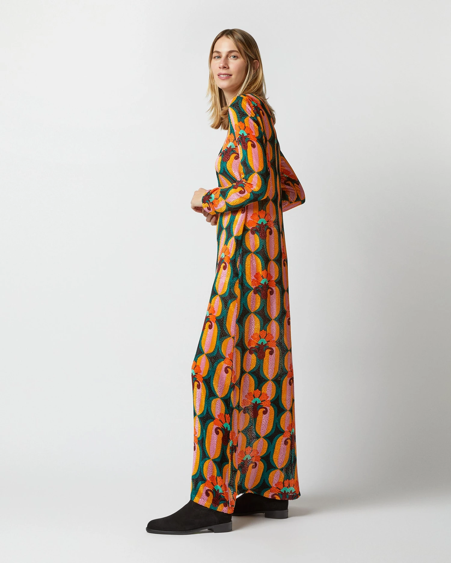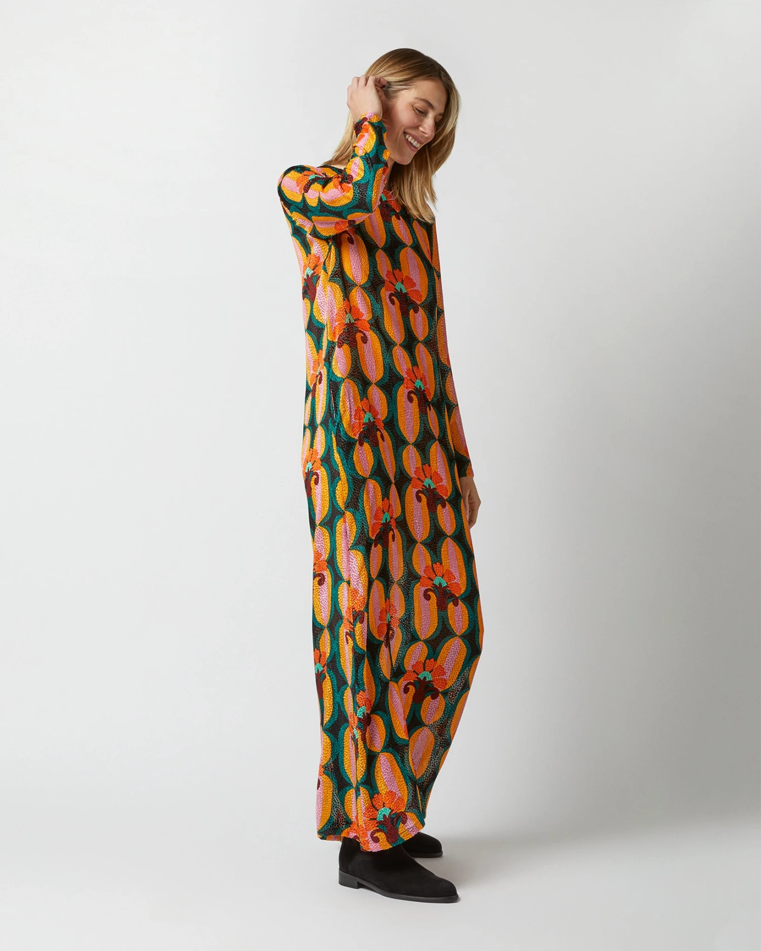 Milan-based La DoubleJ makes party-ready skirts and dresses in reissued vintage fabrics, “distilled through a lens of pure joy, eye-popping print and love of all things maximal.” Sounds about right! This is a long-sleeved version of their very first dress silhouette, made of luxe silk velvet made in Lake Como. It’s designed to take you from Sunday breakfast to a snappy desk job, all the way through cocktails. (Also looks great belted for a little more shape.)
