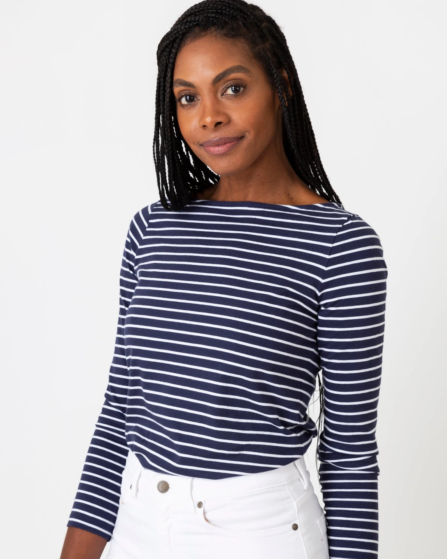 Long-Sleeved Boatneck Tee In Navy/White Stripe Jersey