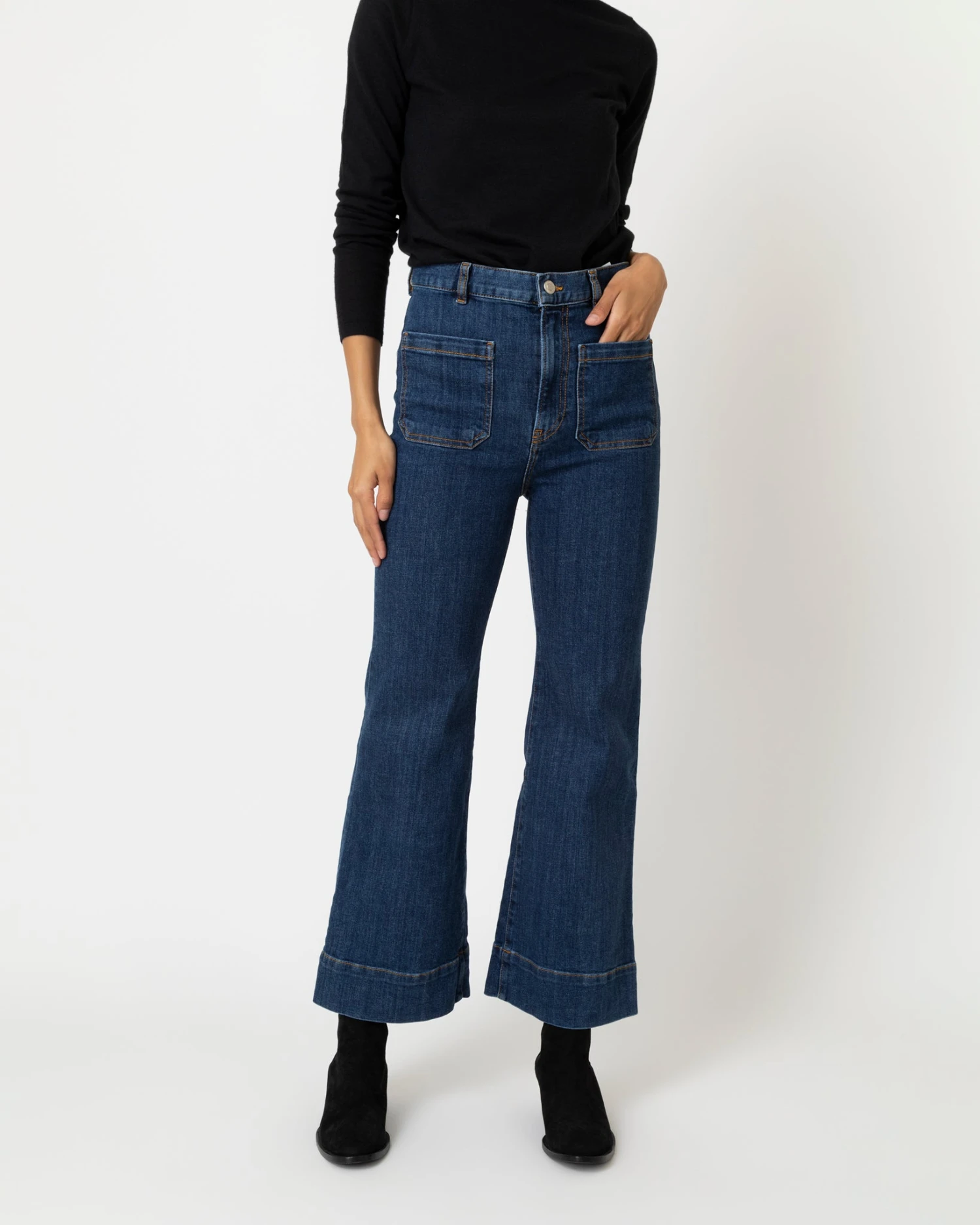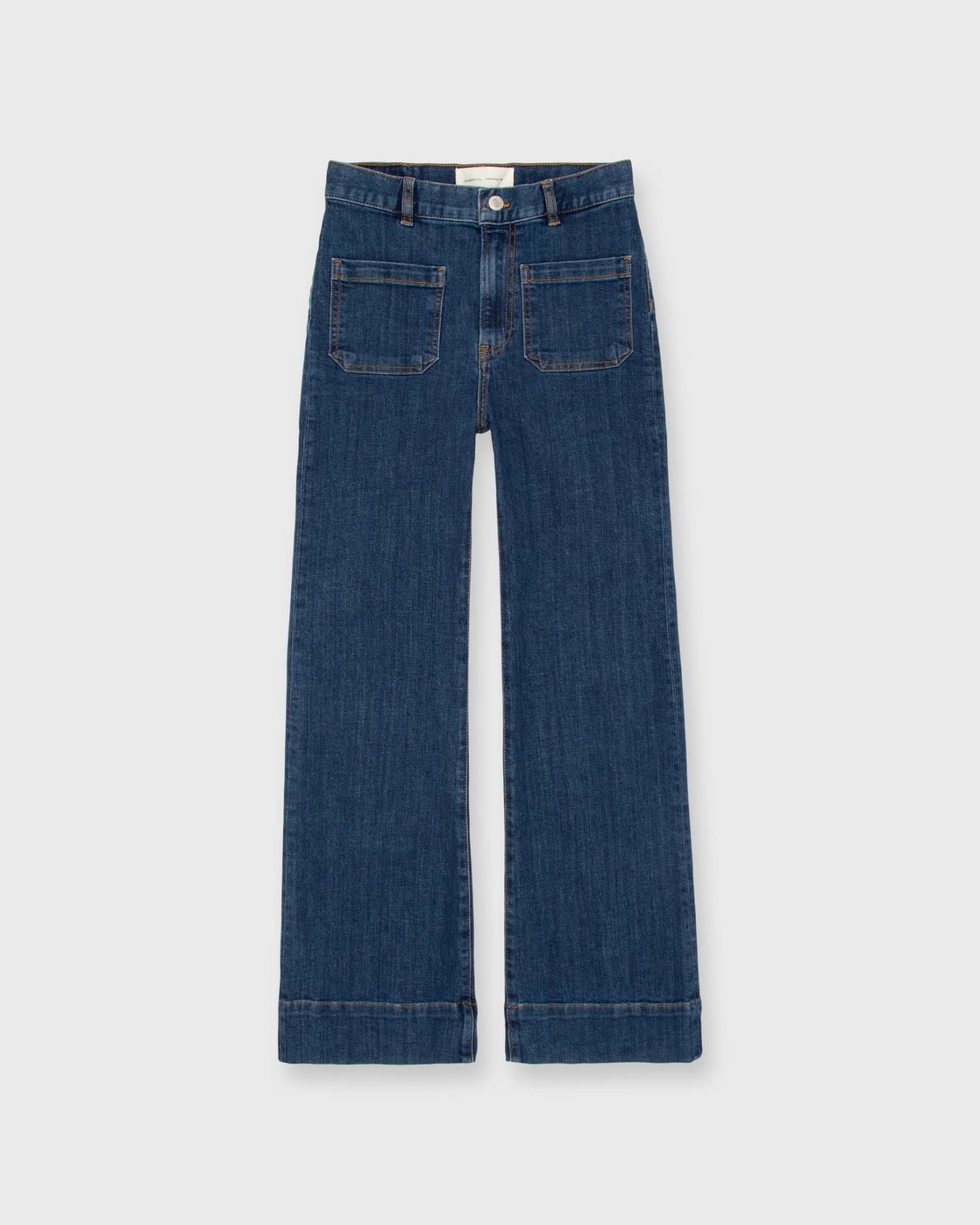 Stockholm-based Jeanerica is our latest favorite minimalist denim line, specializing in “essential styles in perfect fits with understated details and expert washes.” Sounds pretty good to us. The St. Monica is a sailor-style silhouette with a super high rise, a flared leg, and patch pockets. This pair is made of an even, medium-blue stonewashed denim with a touch of stretch to it.