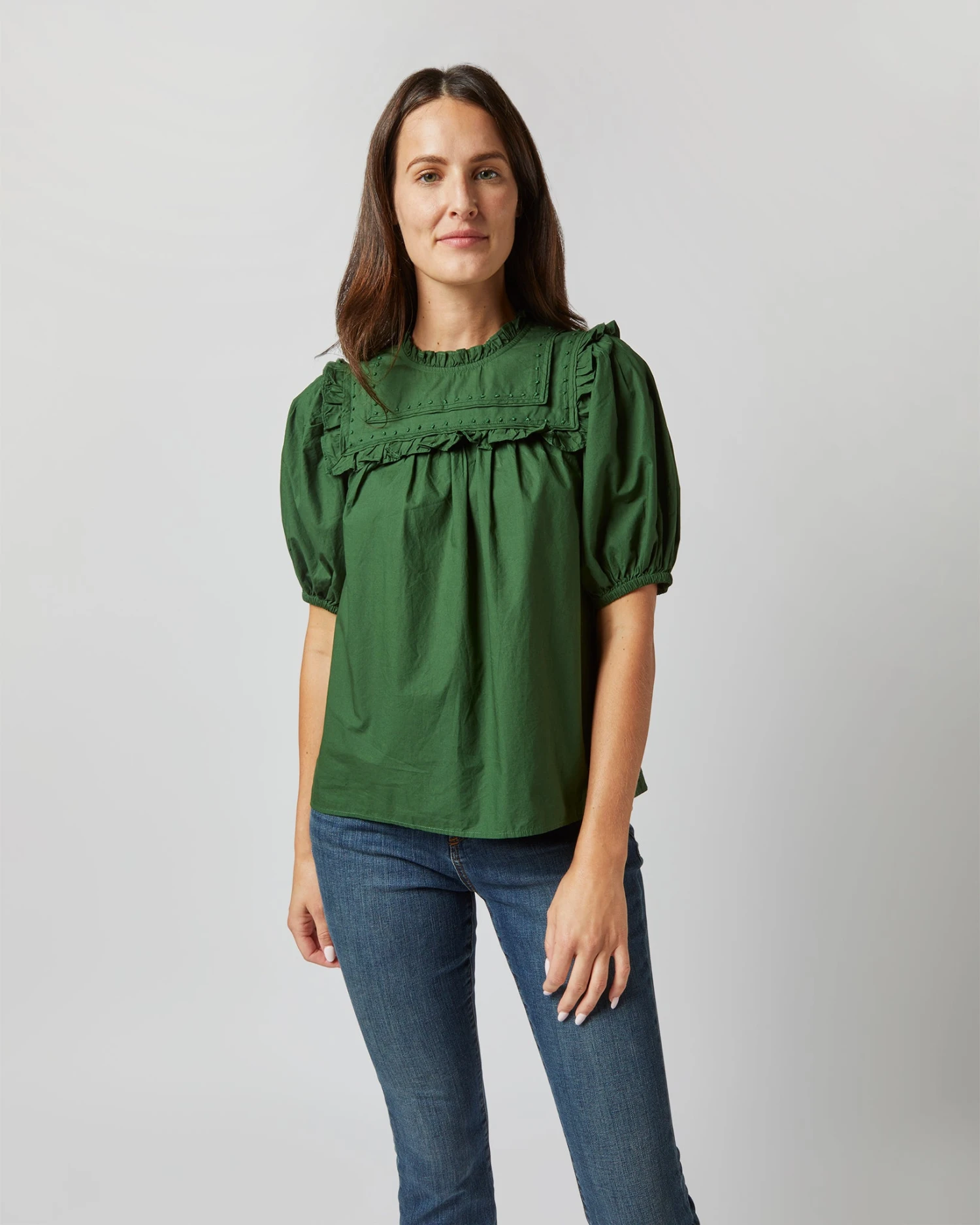 In-store favorite Ulla Johnson makes feminine, bohemian pieces that are heavy on handcraft and special details. And accordingly, the Adeline shape checks all the boxes when it comes to femininity: short puffed sleeves, ruffled trim at the yoke, hand-embroidered cotton poplin… you get the idea.