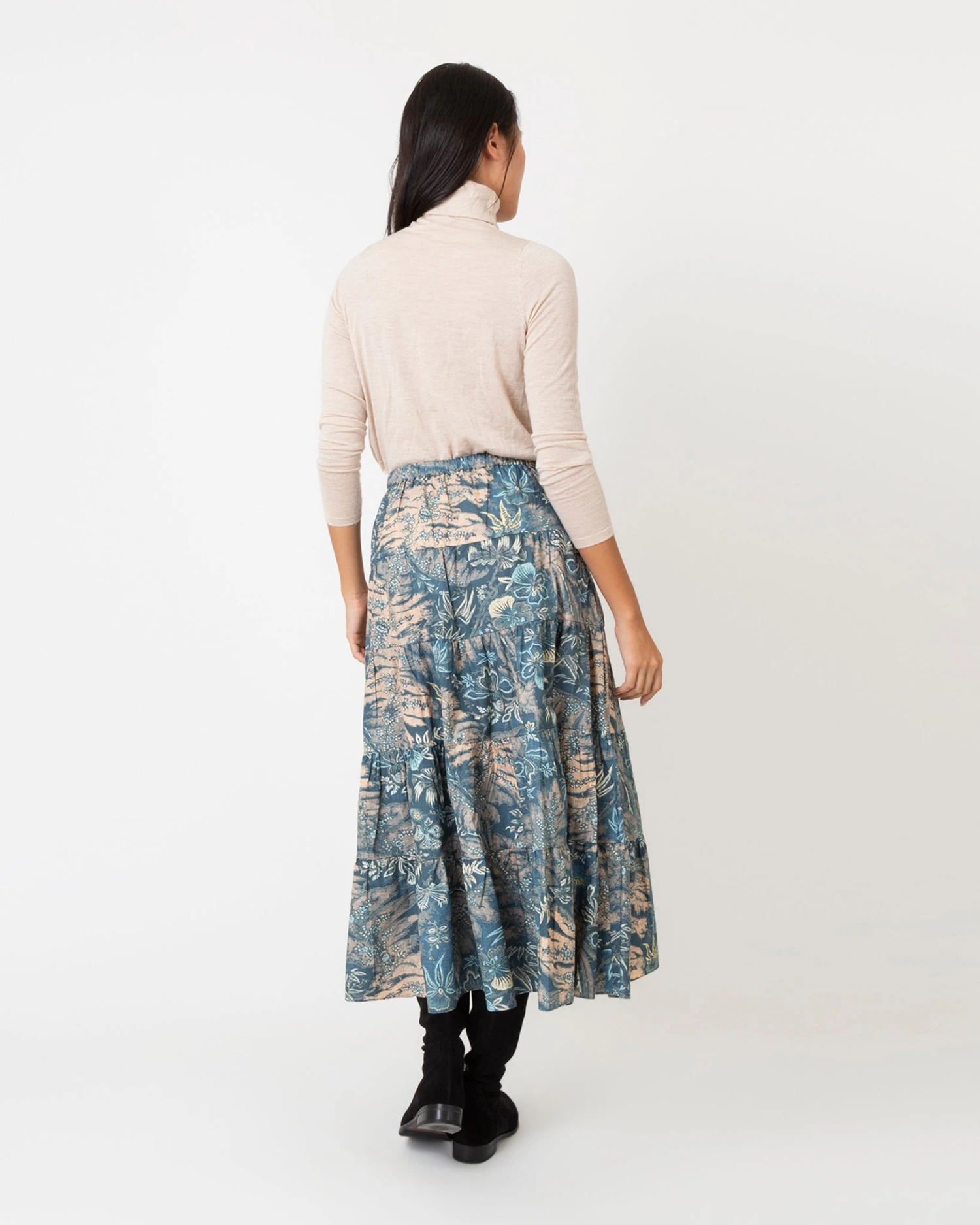 In-store favorite Ulla Johnson makes feminine, bohemian pieces that are heavy on handcraft and special details. The Pre-Fall 22 collection is influenced by Georgia O’Keefe’s paintings of ‘the faraway’, with a palette to match: neutral shades of bone and shell, brights like vermilion and peony, desert golds and ochres, and the soft blue of the sky. The Makana Skirt is a tiered, ankle-length silhouette with an elastic, drawstring waist trimmed with contrast ribbon. It’s made of crisp cotton in a gentle, ocean-blue floral print.