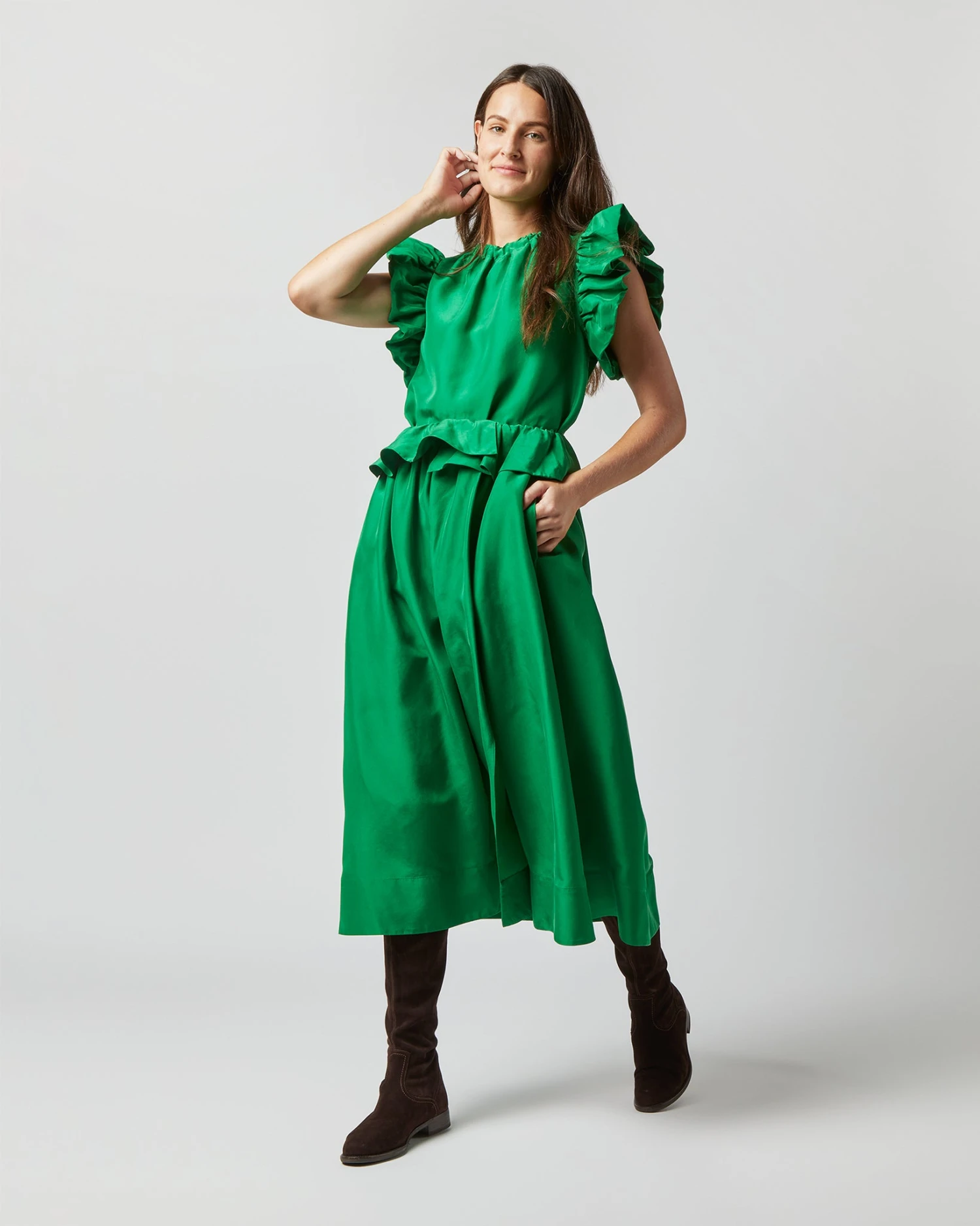In-store favorite Ulla Johnson makes feminine, bohemian pieces that are heavy on handcraft and special details. The Ulyssa skirt has a ruched, ruffled waistband with a front slit and handy French pockets. It’s made of silk taffeta in a beautifully saturated shade of emerald green. Wear it on its own or go for the full look with the matching top.
