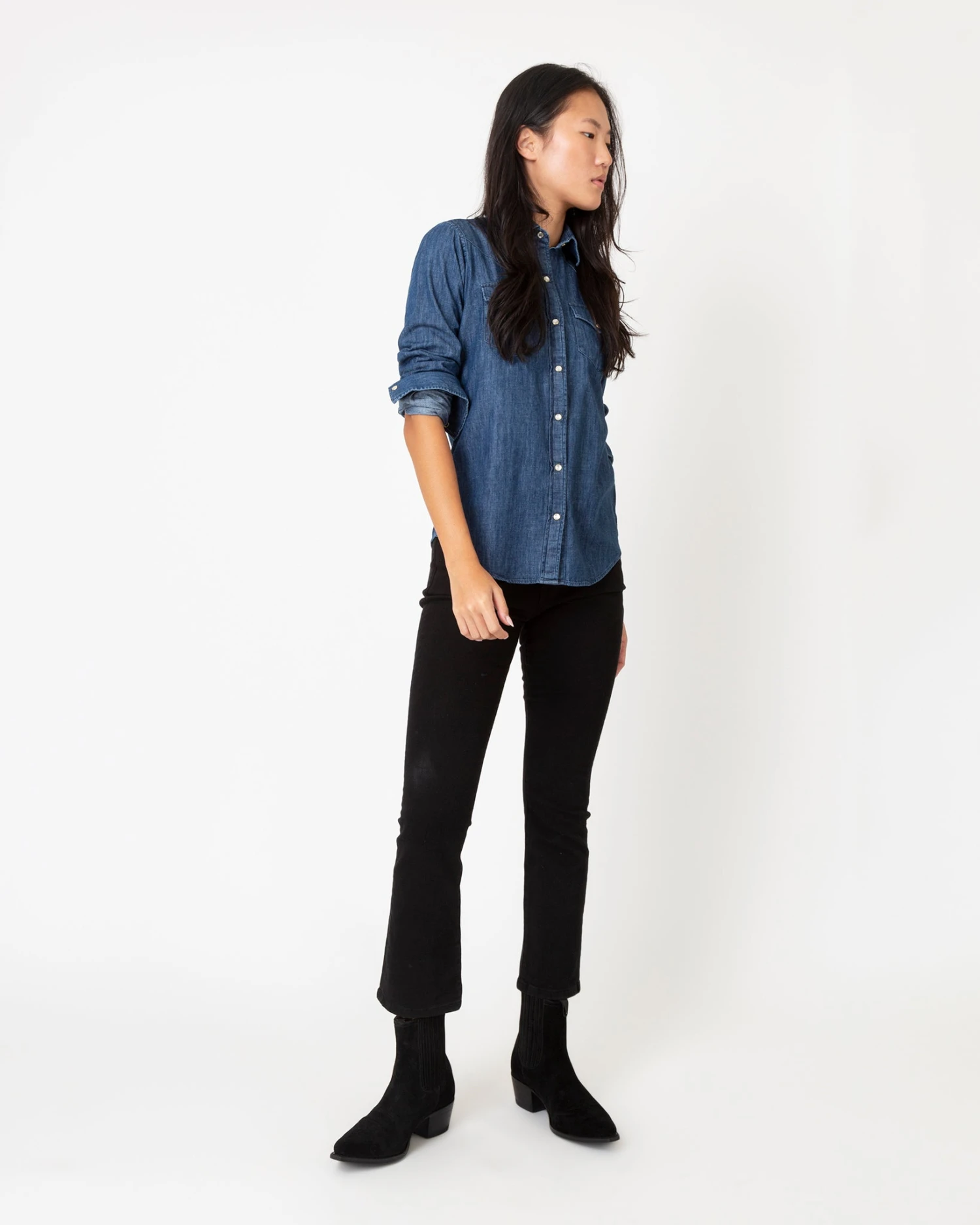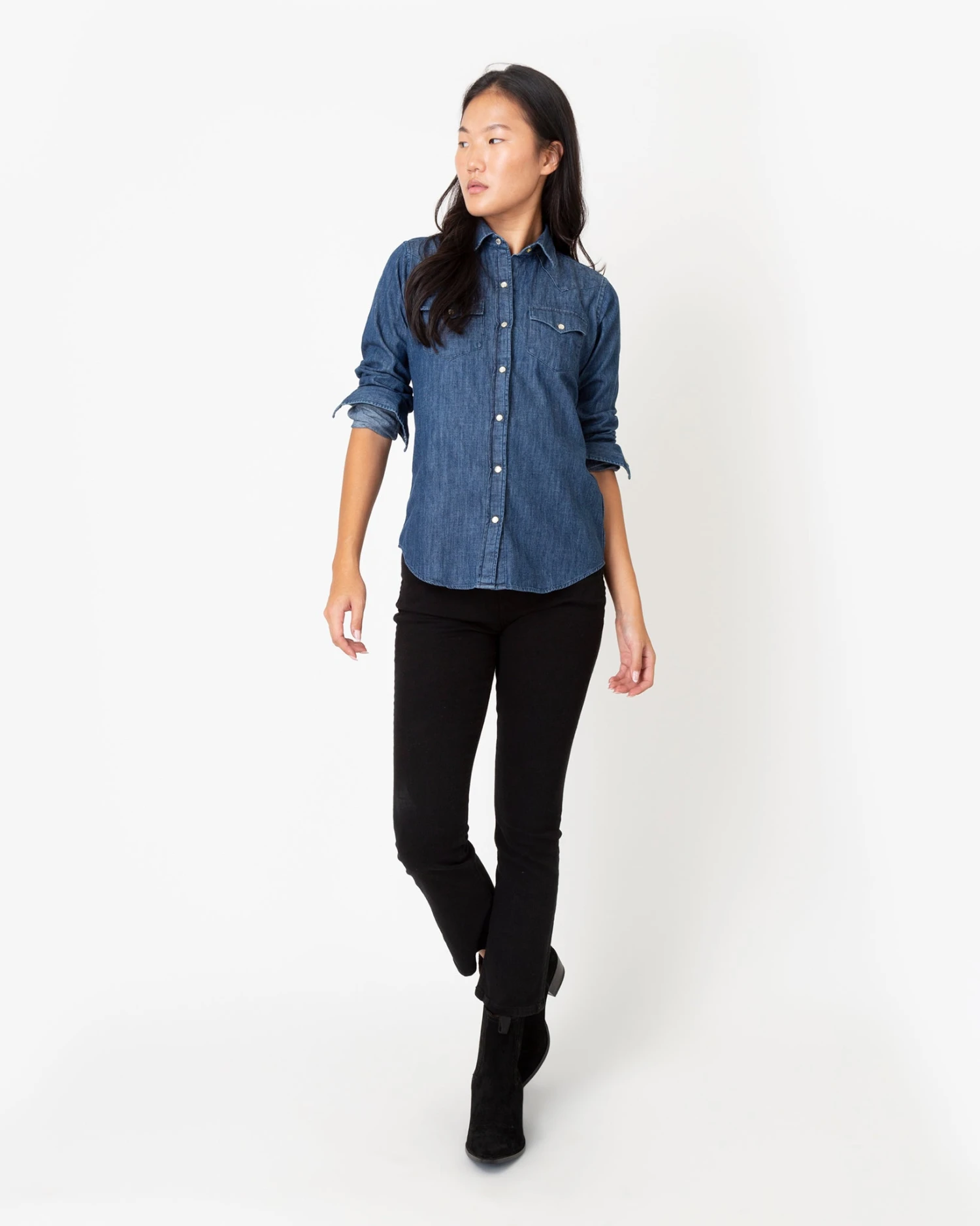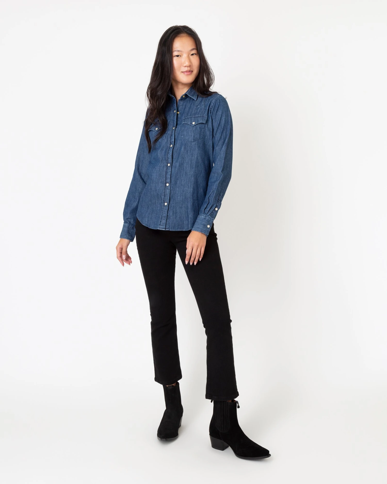 This is an easy-fitting Western-style shirt, down to the pointed yoke, the pearl snaps, and and the twin front pockets. The shape is a little oversized so you can wear it on its own or layer it over a tee or a dress like you would with a lightweight jacket. It’s made from a soft, washed-down indigo denim with a little fading.