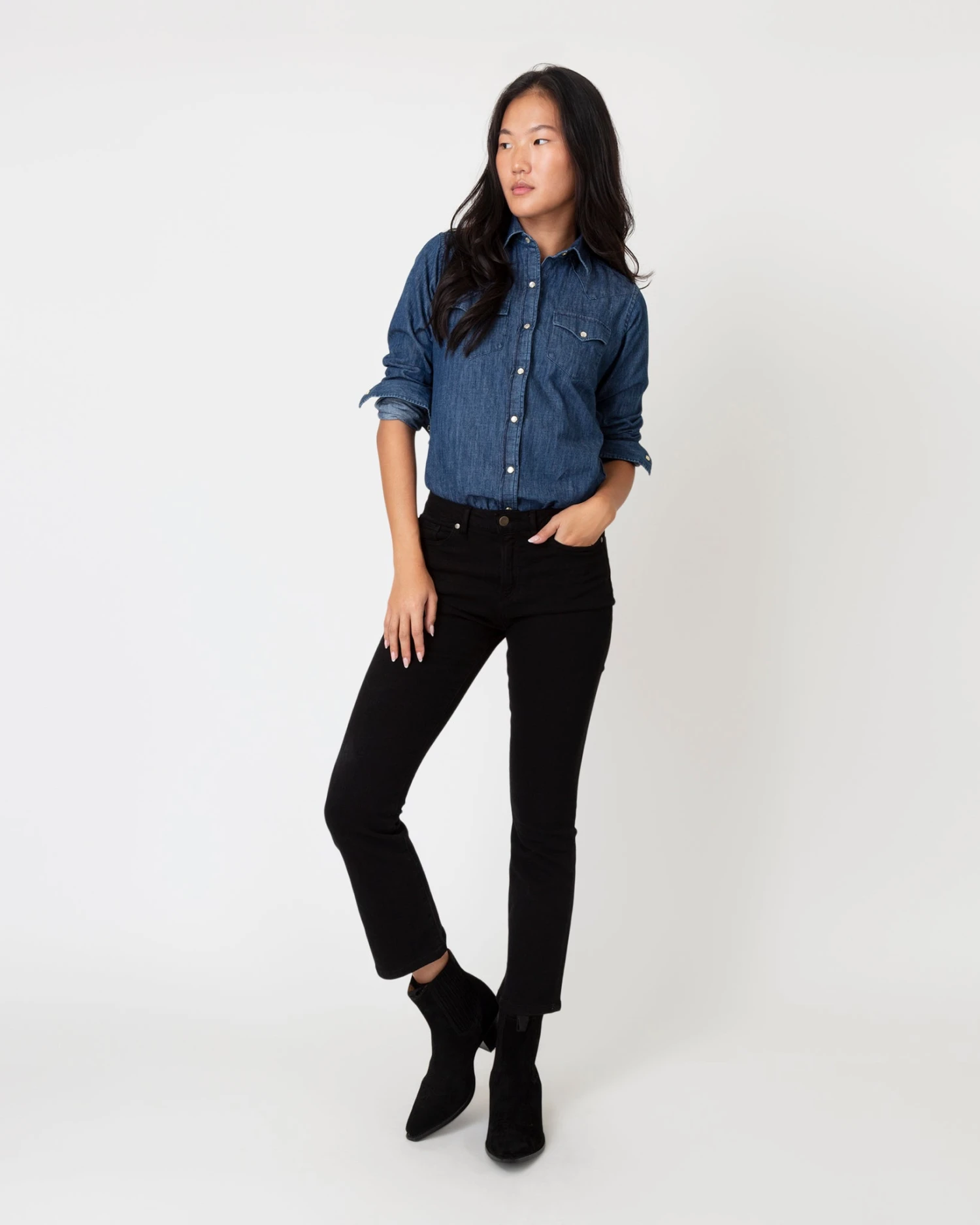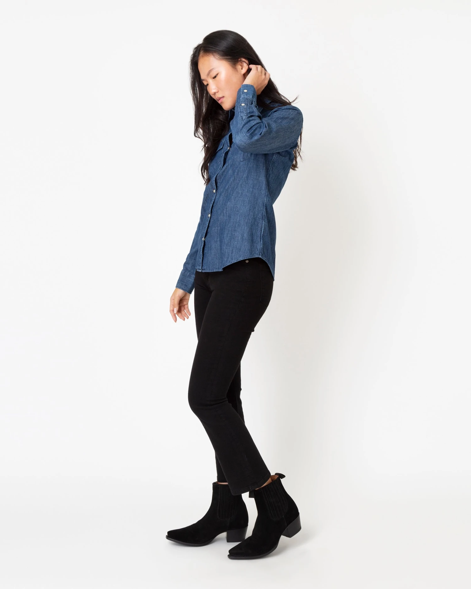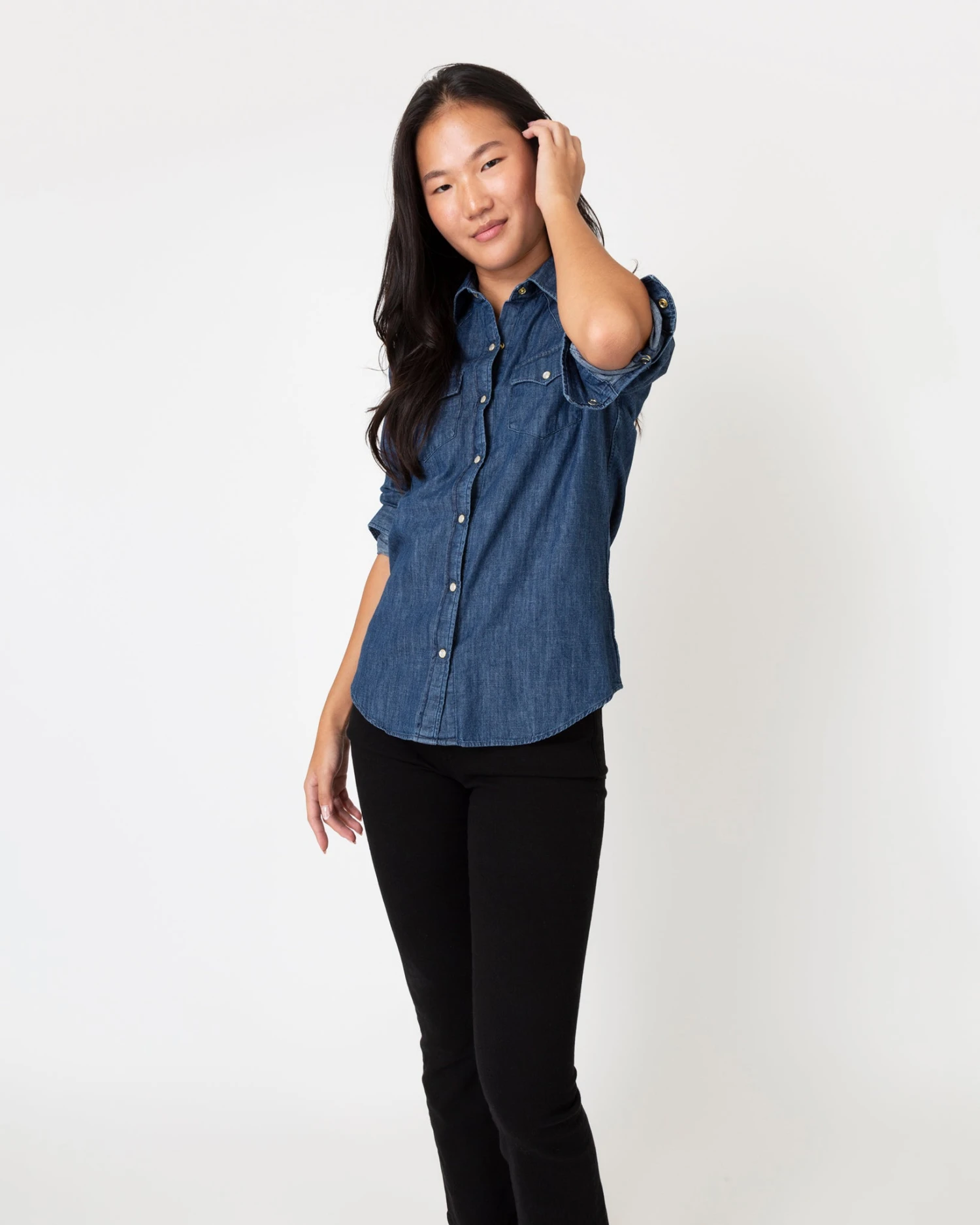 This is an easy-fitting Western-style shirt, down to the pointed yoke, the pearl snaps, and and the twin front pockets. The shape is a little oversized so you can wear it on its own or layer it over a tee or a dress like you would with a lightweight jacket. It’s made from a soft, washed-down indigo denim with a little fading.