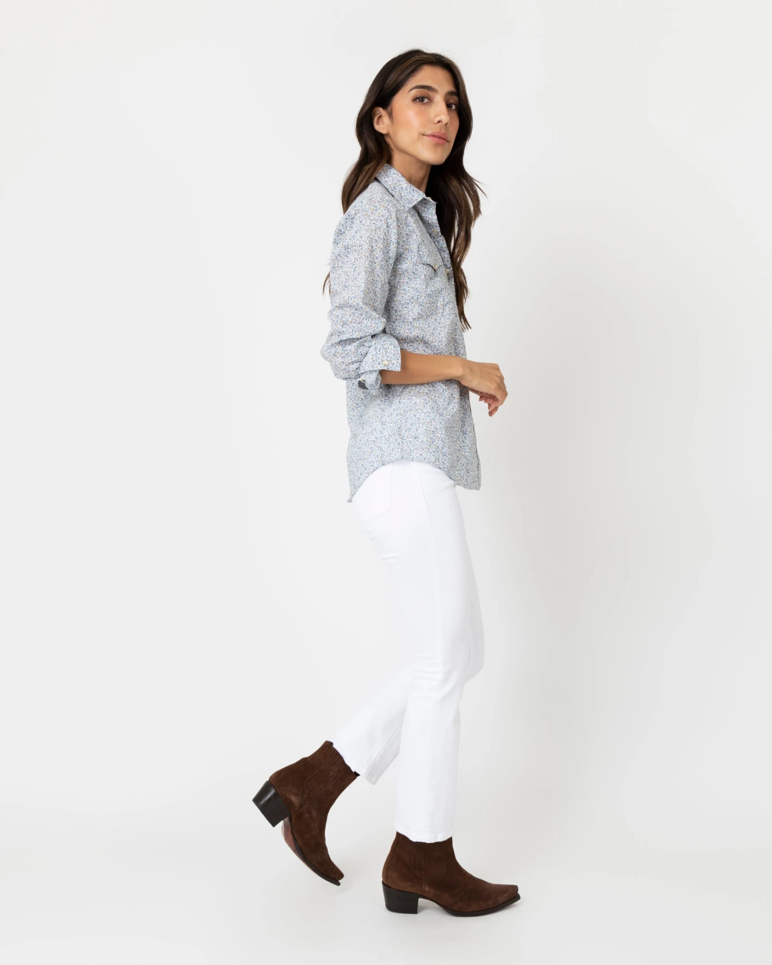 This is an easy-fitting Western-style shirt, down to the pointed yoke, the pearl snaps, and the twin front pockets. The shape is a little oversized so you can wear it on its own or layer it over a tee or a dress like you would with a lightweight jacket. This one’s made up in a delicate, cheerful poppy floral from Liberty Fabrics.